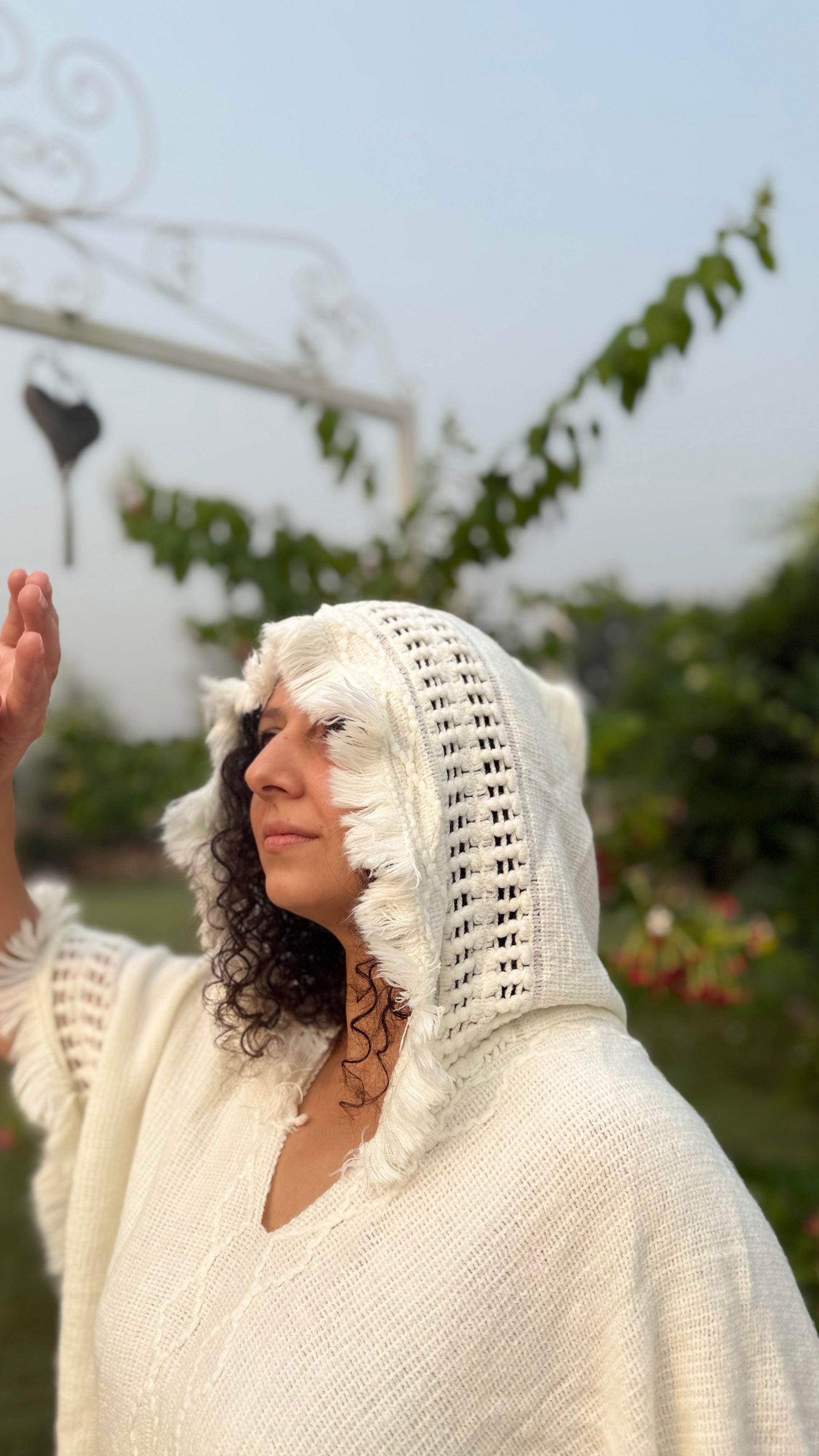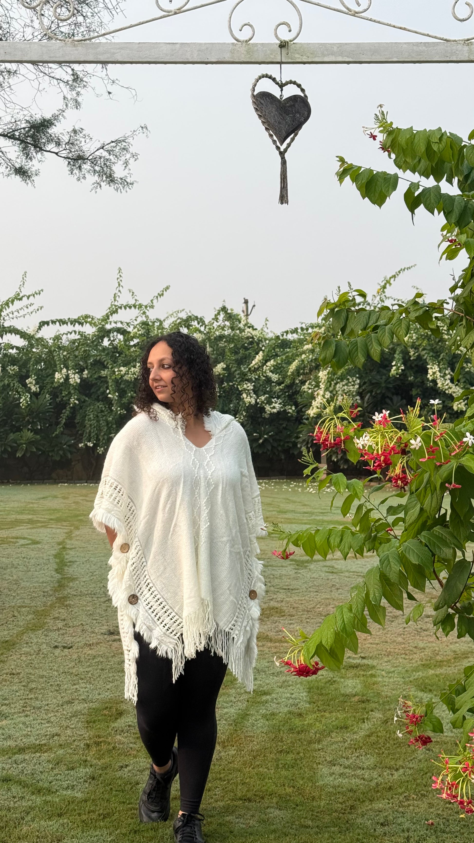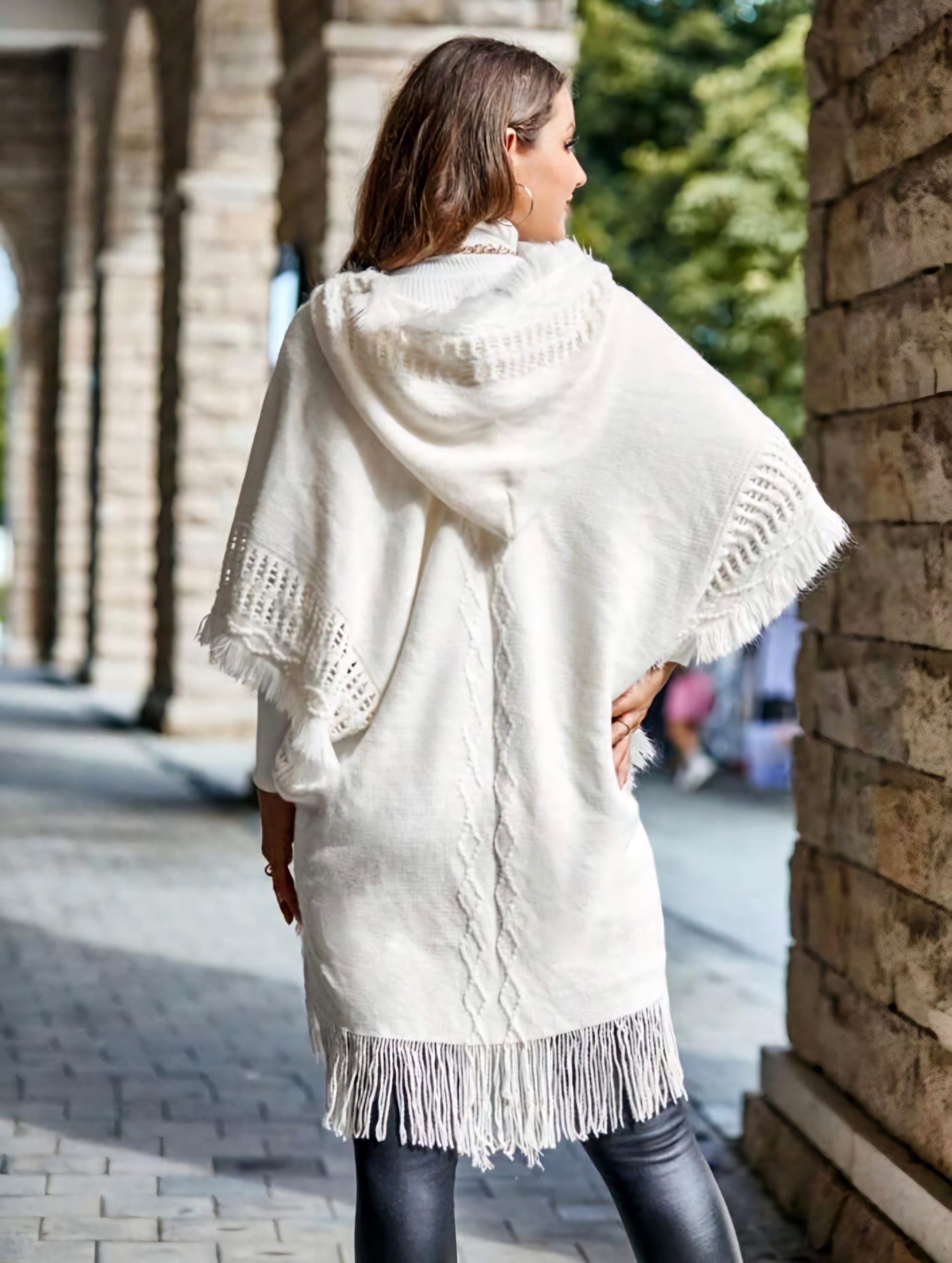 A cozy white poncho-style sweater with a hoodie, blending comfort and chic for effortless everyday warmth.